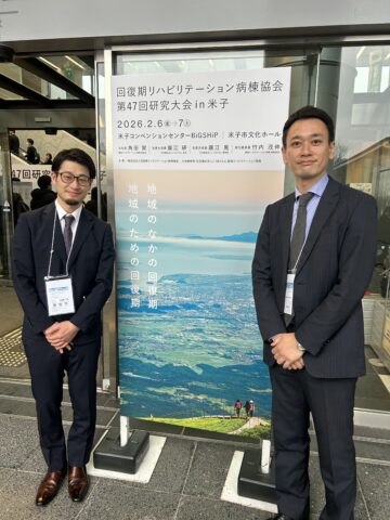 令和8年2月6日~2月7日に回復期リハビリテーション病棟協会第47回研究大会in米子が開催され、当院からは「廃用症候群患者における運動機能改善に影響する因子の検討」「心不全と間質性肺炎を呈した患者に対してCPX未実施下で分割した有酸素運動を実施し耐久性改善と歩行獲得が図れた1症例」の2演題発表を行いました。今後もリハビリを提供する上で生じる疑問や成果を学術活動へとつなげていけるよう努めていきます。